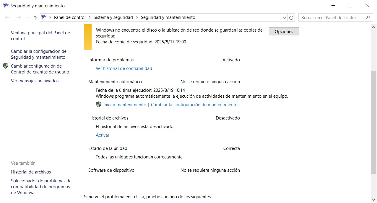 2. Expande la opción «Mantenimiento» y busca la sección «Estado de la unidad».