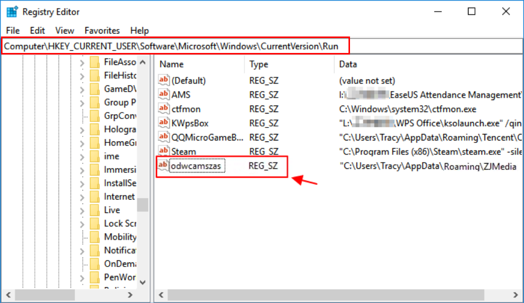 Paso 3: Busca claves sospechosas, como odwcamszas, WXXKYz, ZGFYszaas o OUzzckky, y elimínalas.